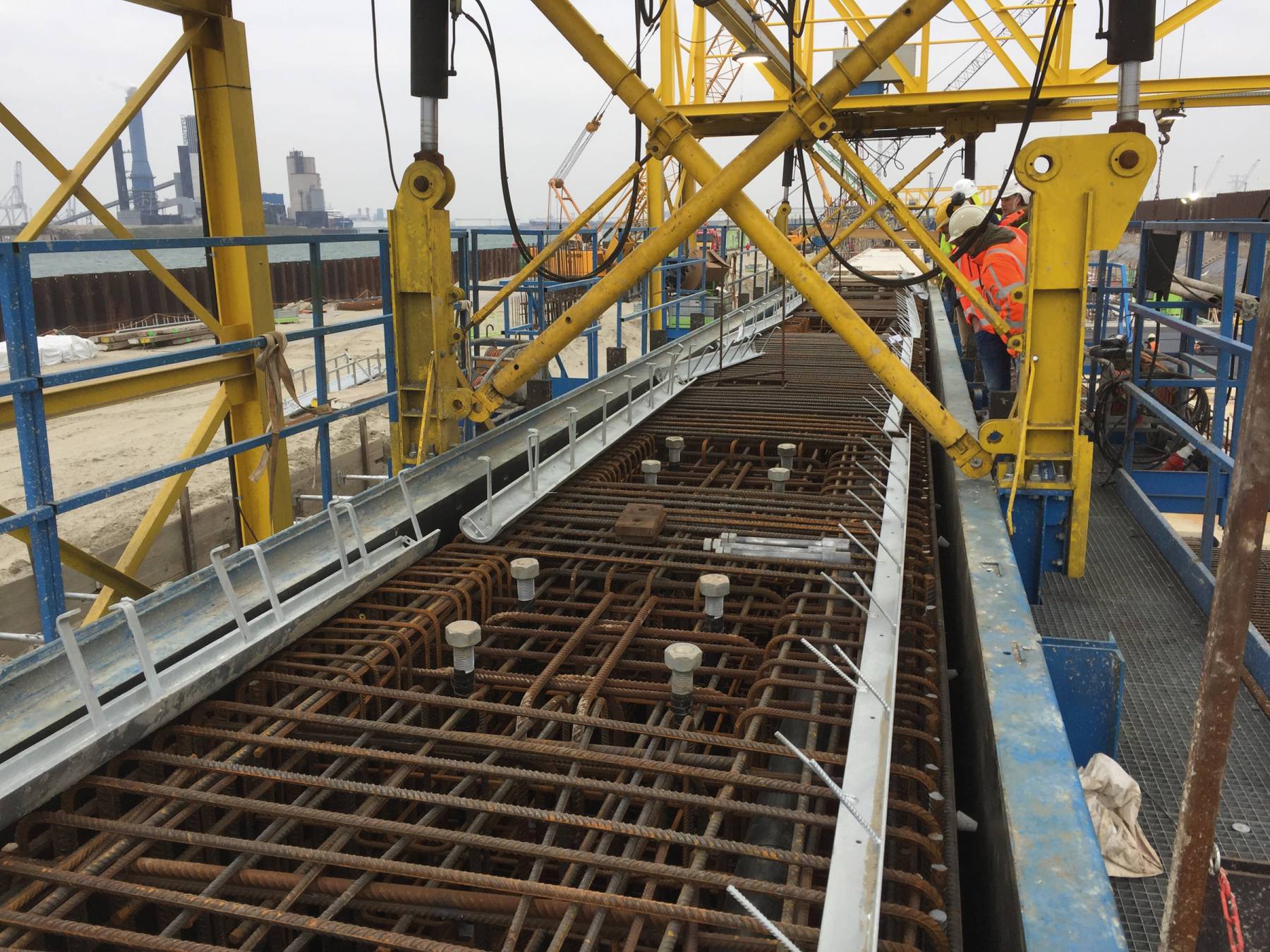 Alle 3 Sätze sind komplett mit hydraulisch betriebenen Portalkränen mit Fernbedienung ausgestattet. Die Schalung kann seitlich 1,0 m hydraulisch geöffnet werden. Stahl-Arbeitsbühnen, Zugangstreppen, Handläufe und Beleuchtung sorgen für ein sicheren Arbeitsbereich.