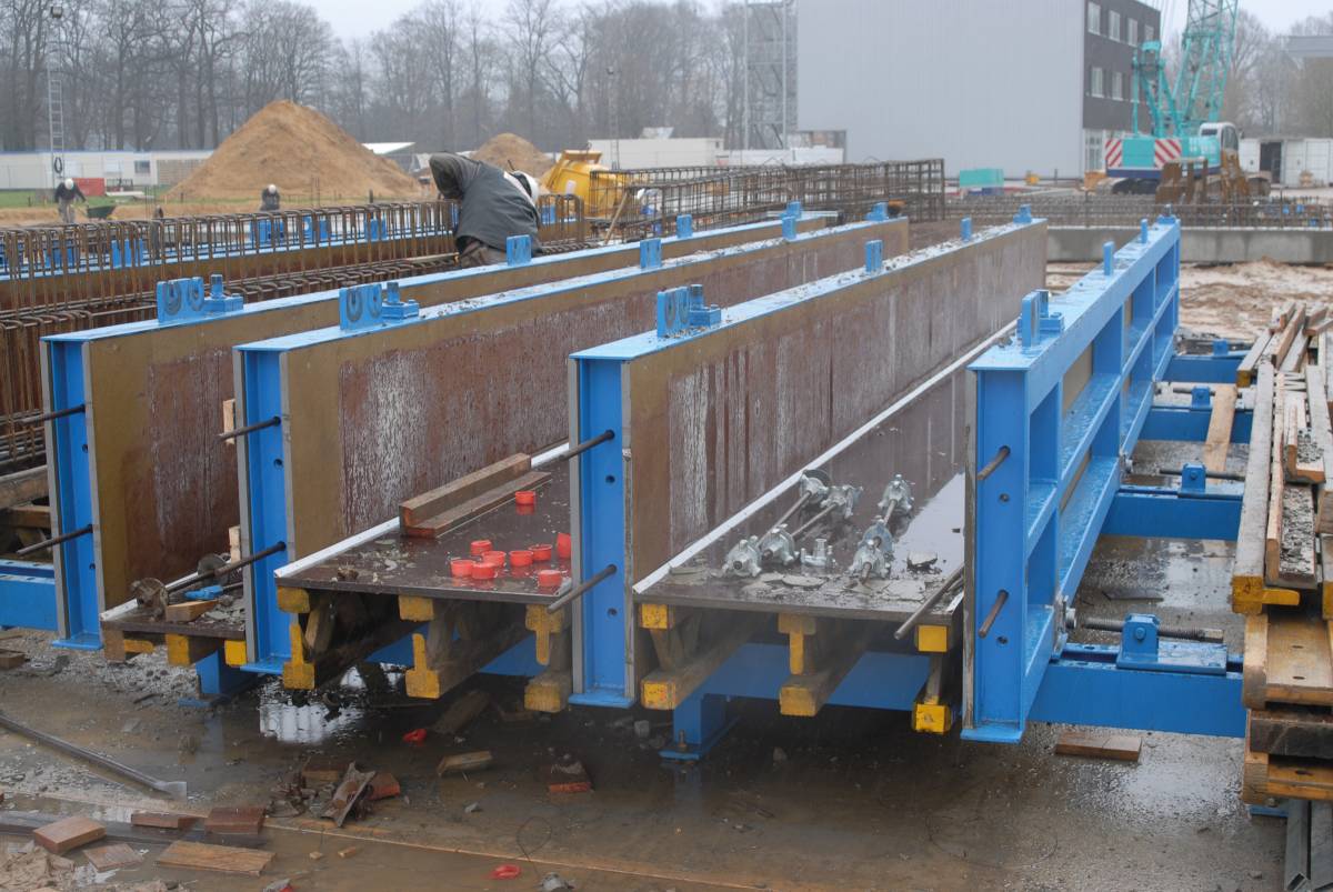Precast battery moulds for the on-site prefabrication of beams and columns.