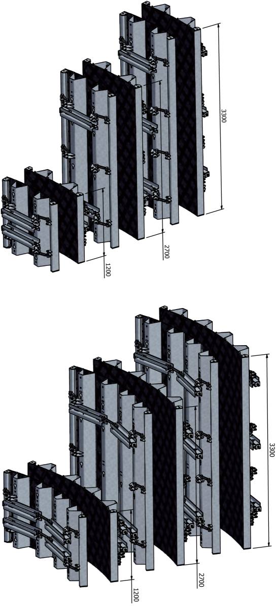 - 3 panel heights (3300mm, 2700mm and 1200mm), each with 2 widths for the inside panels (2400mm and 1260mm) as well as for the outside panels (2500mm and 1300mm)