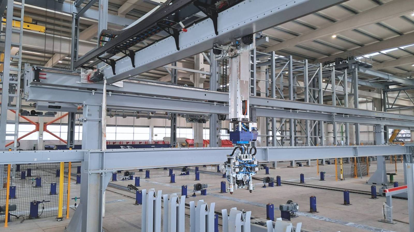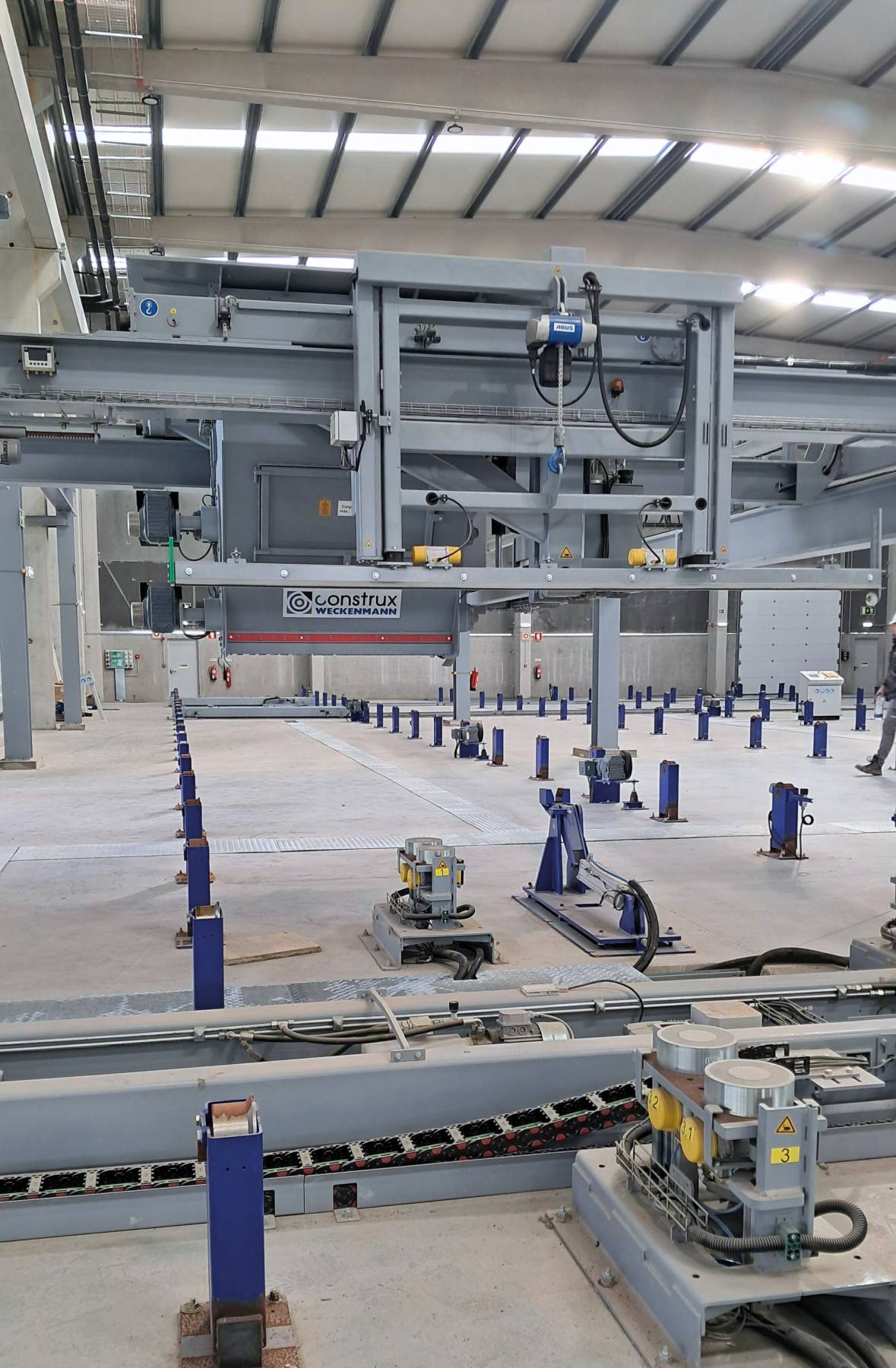 Una estación central de vertido de concreto abastece a ambas naves, con un distribuidor de concreto compartido y un cubo adicional para la Nave 2. Este distribuidor de alto rendimiento está equipado con un rodillo con púas que garantiza una distribución precisa y uniforme del concreto. Integrado en esta estación se encuentra el sistema de compactación MagVib, que utiliza tecnología electromagnética de alta frecuencia para lograr una consolidación superior del concreto.