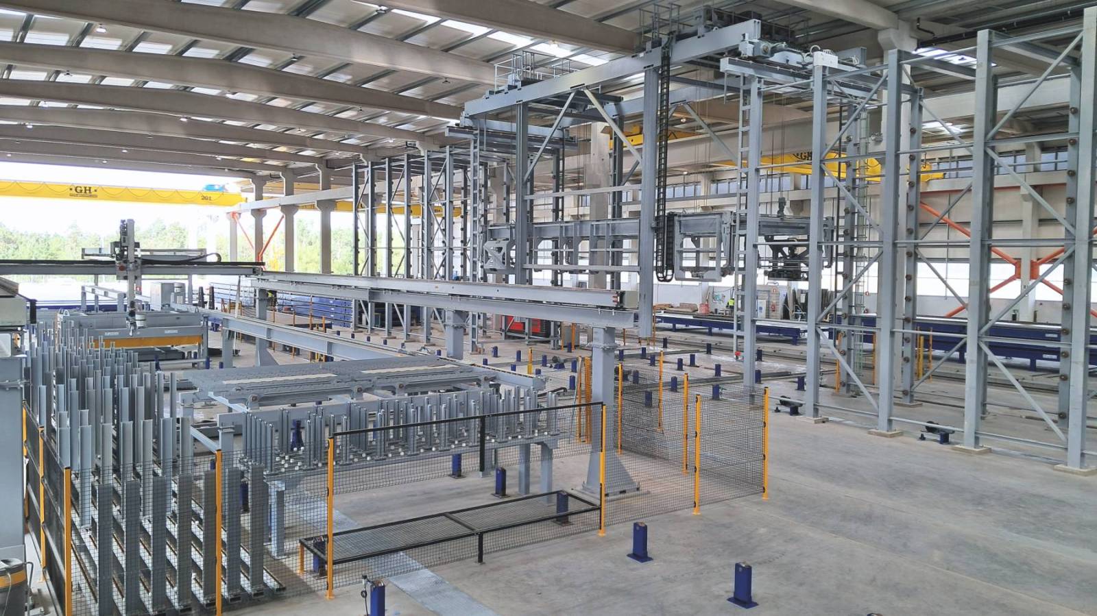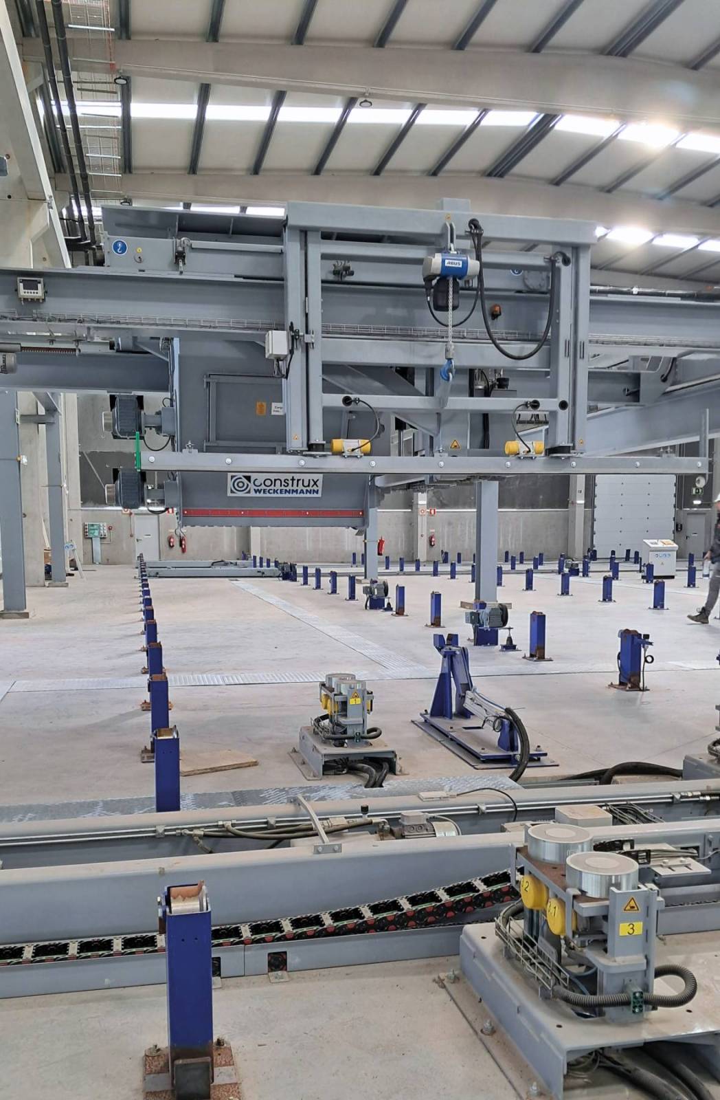 La planta está equipada con sistemas avanzados de automatización y transporte, incluyendo un operador de estanterías para la manipulación de paletas. Una cámara de curado centralizada garantiza la calidad óptima del concreto prefabricado y permite futuras ampliaciones. Además, un sistema de traslado central optimiza el flujo de trabajo entre ambas naves.