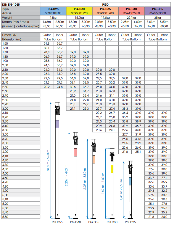 De 5 verschillende PGD schoren hebben gezamenlijk een bereik van 1,46m tot 5,50m. Ze zijn robuust, gegalvaniseerd en volledig conform EN-1065. Op hun meest uitgeschoven stand hebben ze alle 5 een toelaatbare belasting van 2T. In combinatie met de Construx vierwegkoppen, driepikkels en H-20 dragers vormen deze PGD-schoren een perfect schoorsysteem.